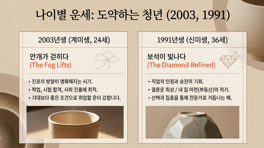 2026년 양띠의 에너지 원리는 단독 질주가 아닌 시너지에 있습니다. 이는 병오년의 강렬한 불(火)의 기운을 양띠의 부드러운 흙(土) 기운이 안정적으로 받아내 단단한 결실로 만드는 원리 때문입니다. 다른 이들이 뜨거운 열정으로 빠르게 질주할 때, 양띠는 그 흐름이 흩어지지 않도록 뒤에서 차분히 정리하고 안정시키며 실속을 챙기는 역할에 최적화되어 있습니다.