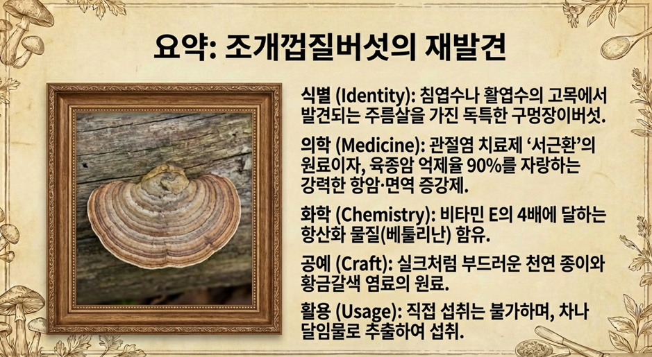갓 아래 주름살 속에 구멍을 숨긴 생물학적 반전부터, 아픈 관절을 다스리던 전통 약재를 거쳐 90%에 달하는 항암 효과를 입증한 현대 과학의 총아, 그리고 비단결 같은 종이와 고운 염료로 변신하는 놀라운 잠재력까지. 조개껍질버섯은 그저 숲의 일부가 아닌, 살아있는 가능성의 보고였습니다. 이 작은 버섯의 사례는 우리 주변의 자연, 특히 무심코 지나쳤던 작은 생물들이 아직 우리가 알지 못하는 무한한 가능성을 품고 있음을 다시 한번 일깨워 줍니다. 우리가 무심코 지나치는 숲속에는 또 어떤 놀라운 비밀이 숨겨져 있을까요?