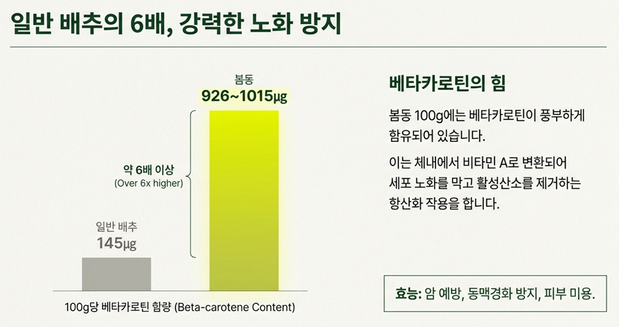 - 베타카로틴: 봄동의 가장 주목할 만한 영양소는 단연 베타카로틴입니다. 100g당 926㎍으로, 일반 배추(145㎍)의 6배 이상 함유되어 있습니다. 베타카로틴은 강력한 항산화 성분으로 노화 방지와 암 예방에 도움을 주며, 우리 몸에서 비타민 A로 전환되어 시력을 보호하고 안구 건조증을 개선하는 데도 효과적입니다.