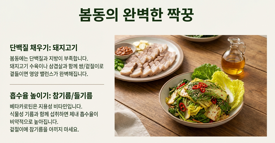 아무리 좋은 식재료라도 어떻게 먹느냐에 따라 그 효과는 천차만별입니다. 봄동의 영양을 200% 끌어올리는 최고의 음식 궁합을 소개합니다. 첫째, 돼지고기 입니다. 봄동은 비타민과 무기질이 풍부한 반면, 단백질과 지방이 부족합니다. 이때 돼지고기와 함께 쌈을 싸 먹거나 겉절이로 곁들이면 부족한 영양소를 완벽하게 보충해 이상적인 영양 균형을 이룰 수 있습니다. 둘째, 참기름 입니다. 봄동의 핵심 영양소인 베타카로틴은 기름에 잘 녹는 지용성 비타민 입니다. 따라서 겉절이를 무칠 때 참기름을 듬뿍 넣거나, 살짝 볶아 요리하는 것은 베타카로틴의 체내 흡수율을 크게 높여주는 과학적인 방법입니다. 맛은 물론 영양까지 생각한 현명한 조합이죠.