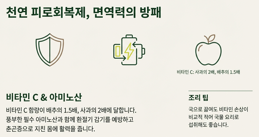 - 비타민 C: 면역력 강화에 필수적인 비타민 C 역시 일반 배추(15.16㎎)보다 약 1.5배 많은 23.28㎎이 들어있어, 환절기 감기 예방에 큰 도움을 줍니다.